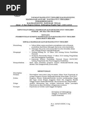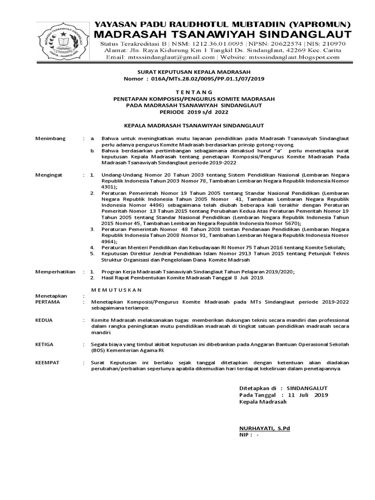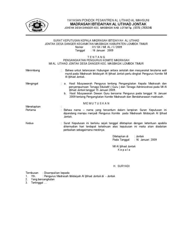 Uuspn no.20 tahun 2003 pasal 56 ayat 3. Contoh sk ini merupakan dokumen administrasi wajib pengelolaan dana bos di tingkat satuan pendidikan. Susunan organisasi terdiri dari pengawas dan pengurus b. Komite madrasah dapat menyampaikan pertimbangan kepada kepala madrasah dengan cara tertulis, atau dapat dilakukan melalui forum rapat. Surat keputusan kepala madrasah ibtidaiyah muhammadiyah.